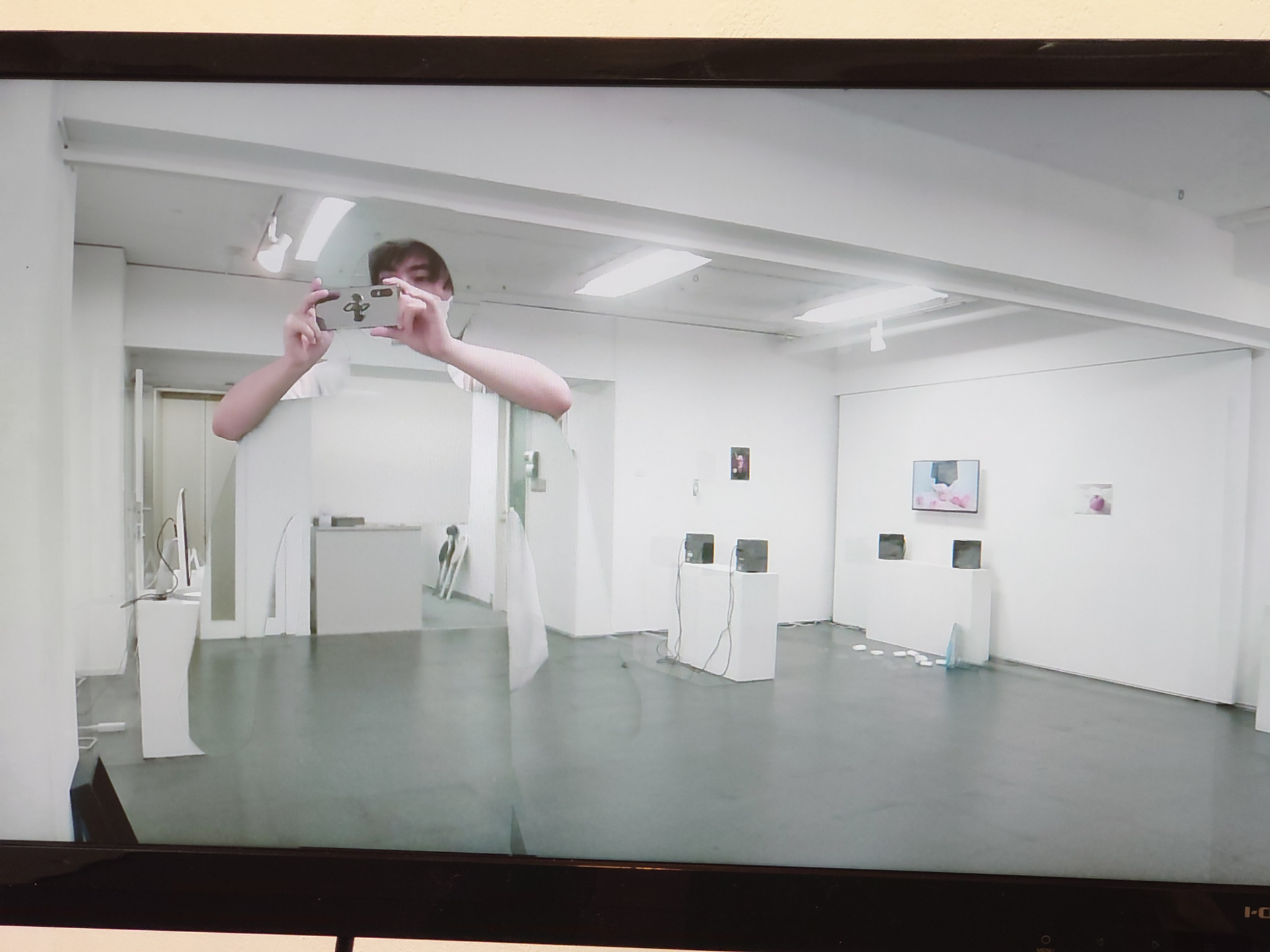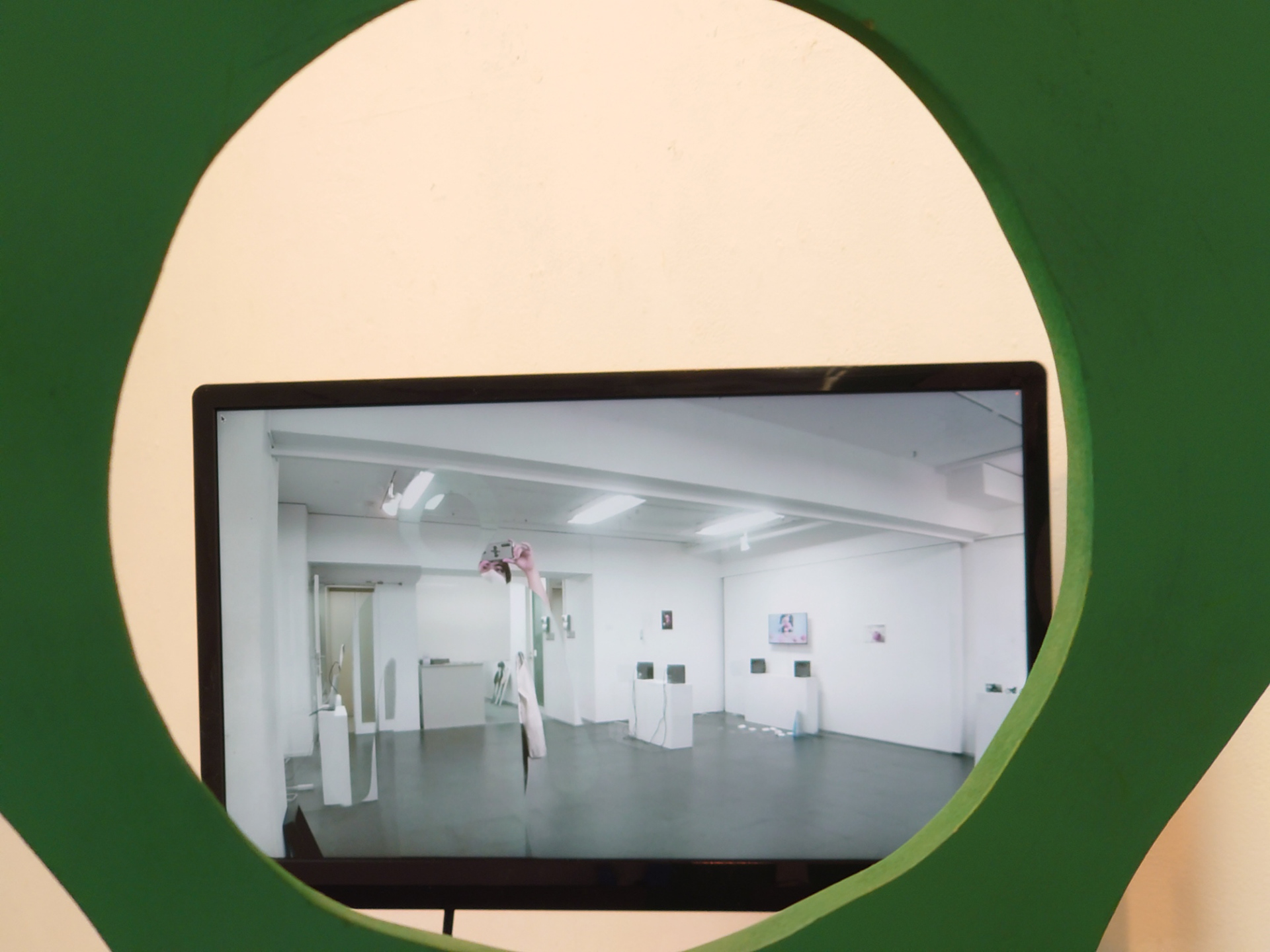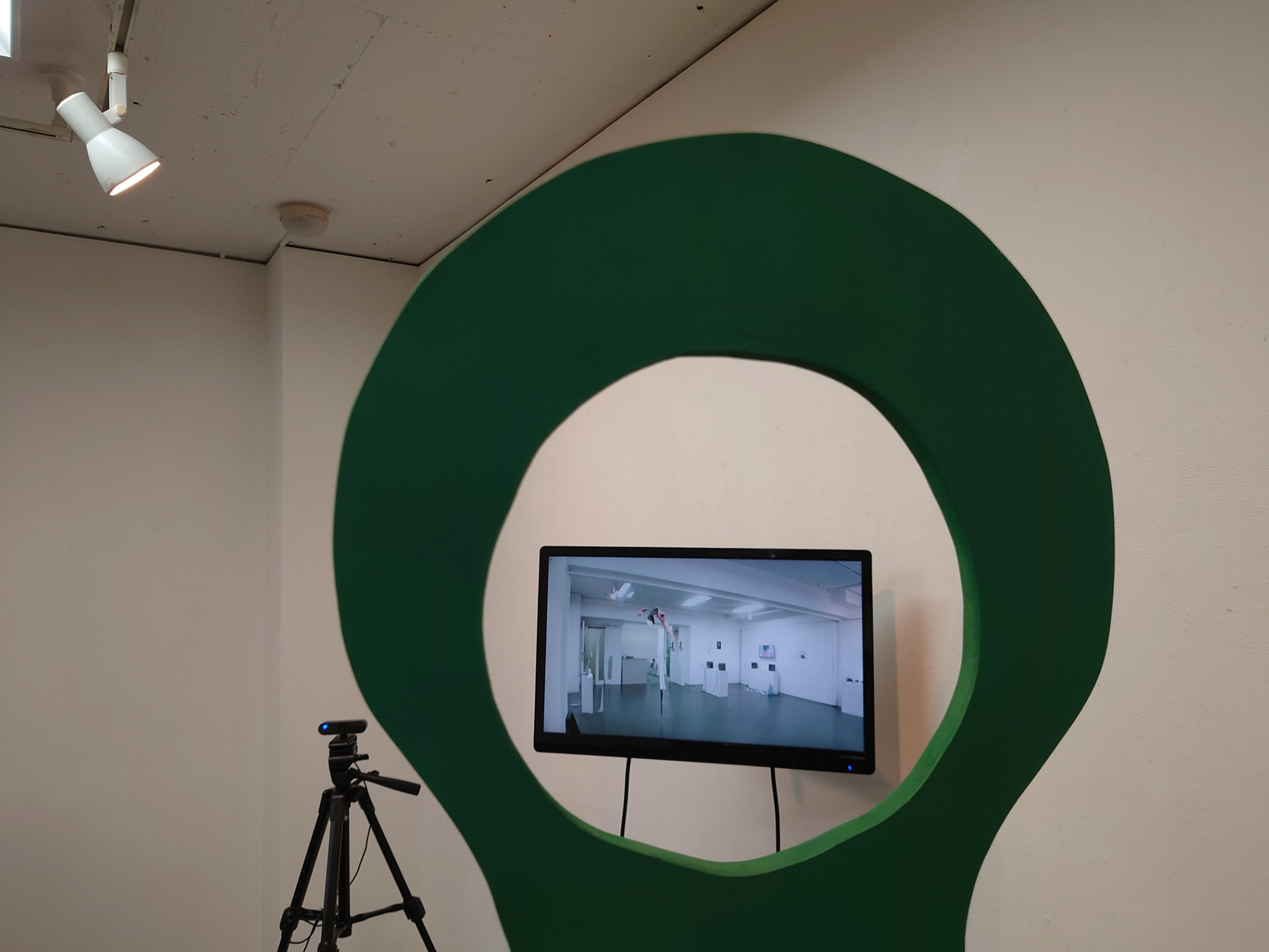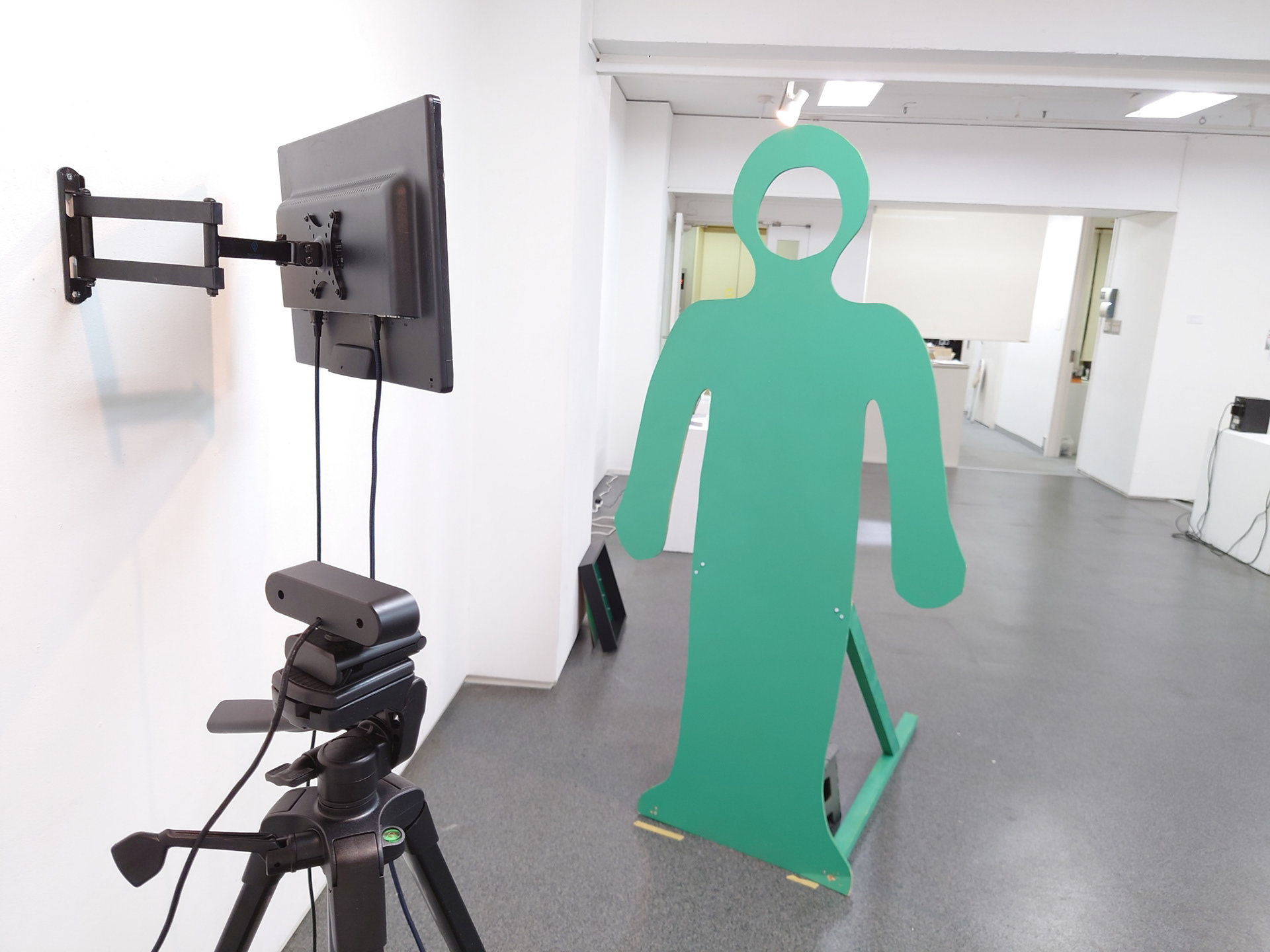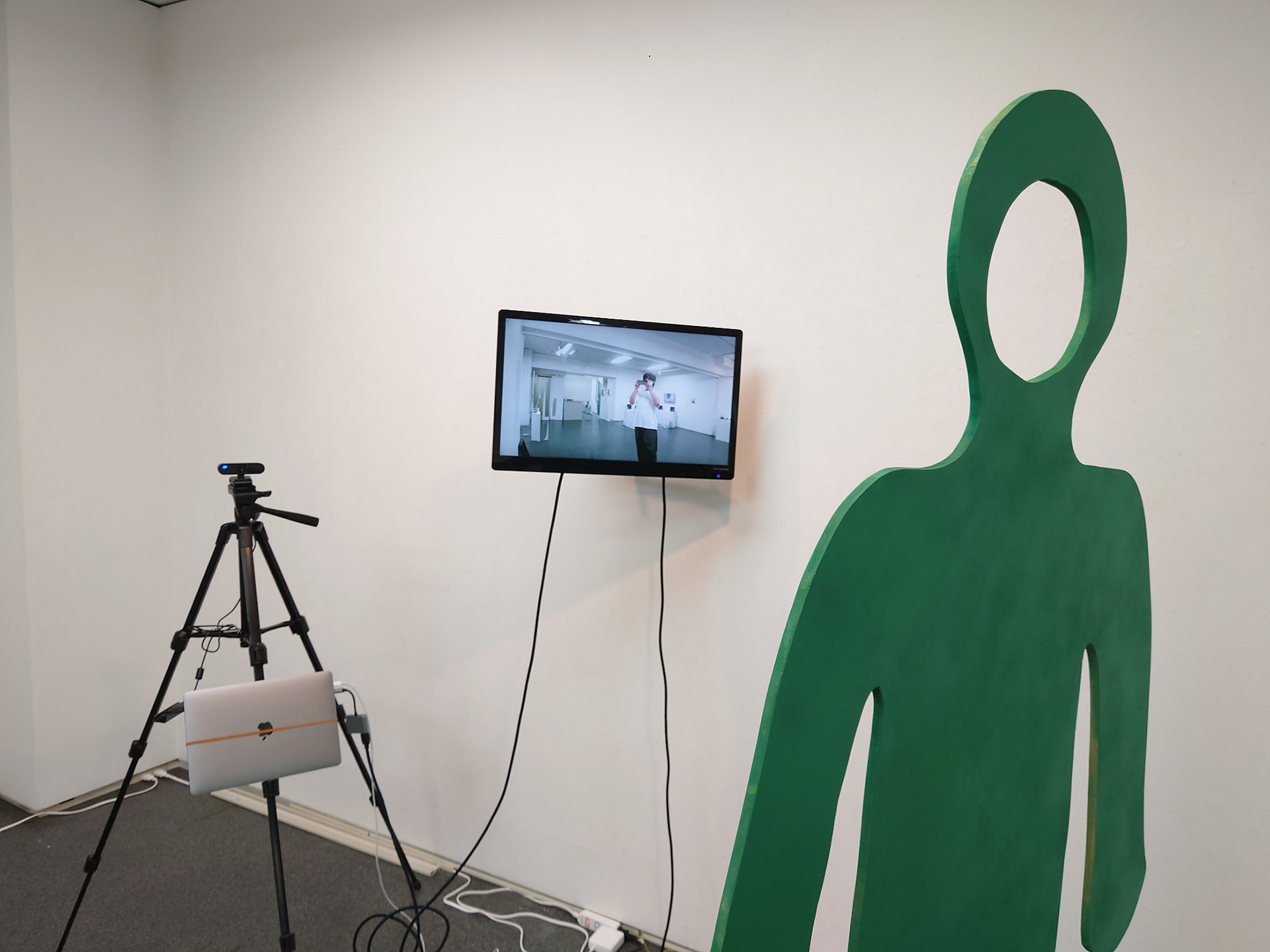 これは緑色の人形パネルとそれを撮影するWEBカメラ、その映像を映し出すモニターで構成された作品です。